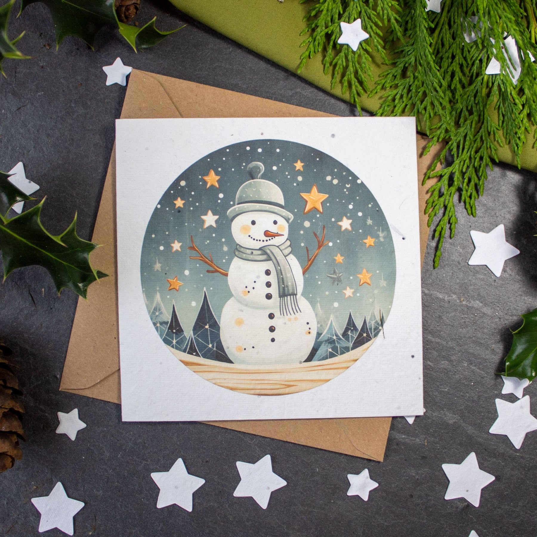 Plantable Christmas card with a smiley snowman. This square card is printed on flower seed paper, measures approx 14cm in size and comes with a recycled brown kraft paper envelope.